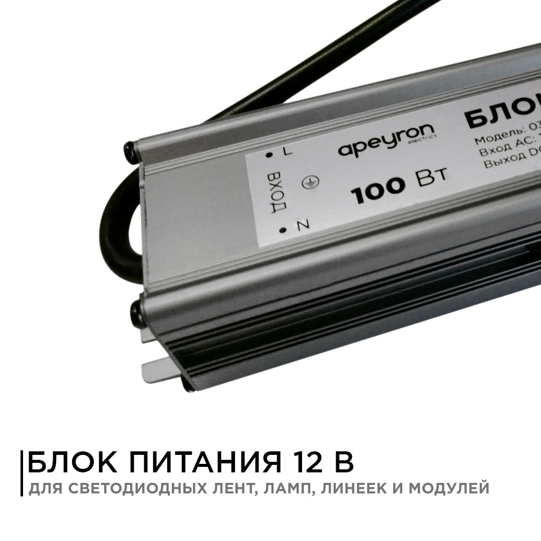Импульсный блок питания Apeyron 03-106 используется для питания светодиодной ленты напряжением 12В и мощностью до 100Вт в сырых и влажных помещениях.