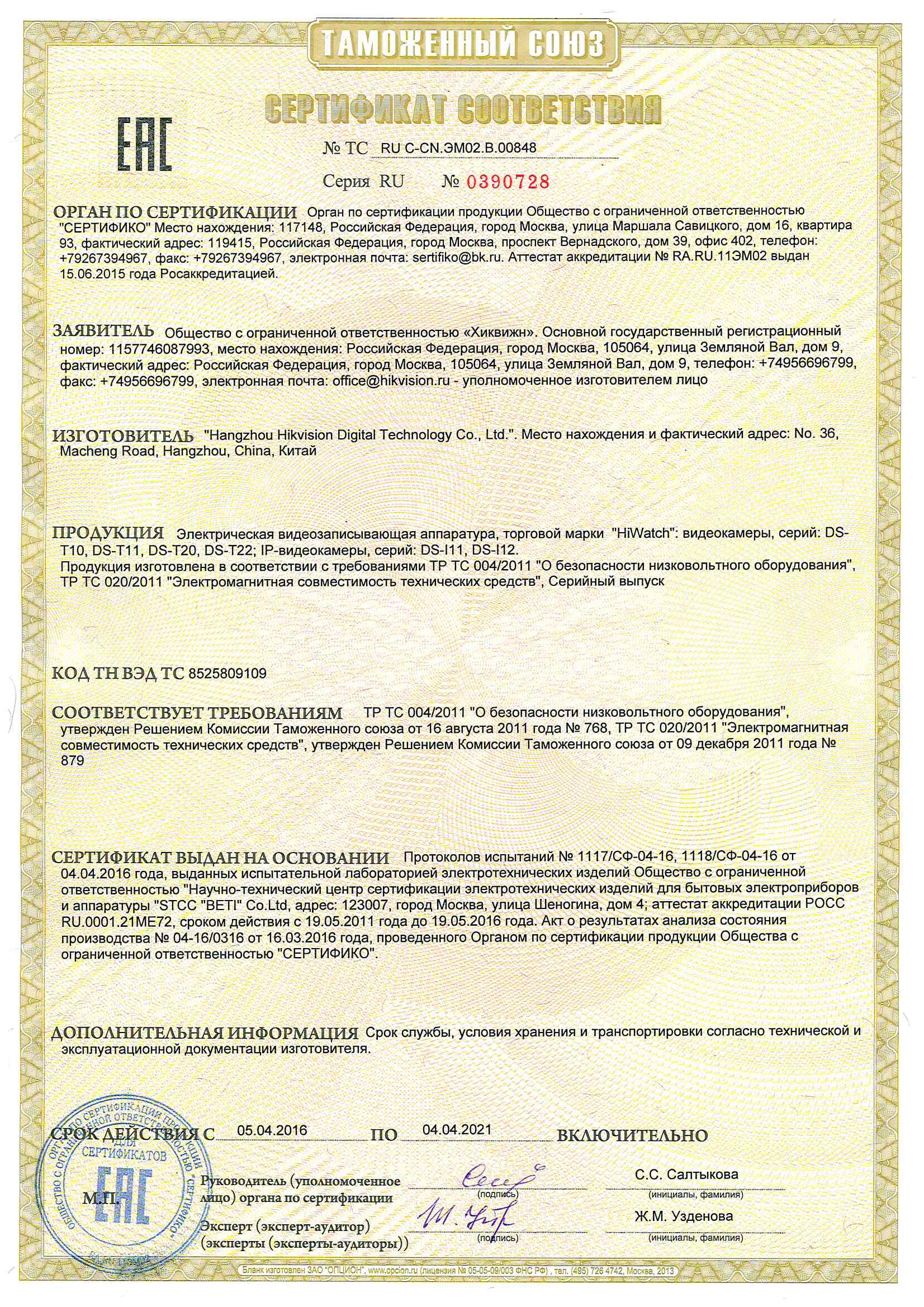 Сертификат на видеокамеру DS-T201 HiWatch