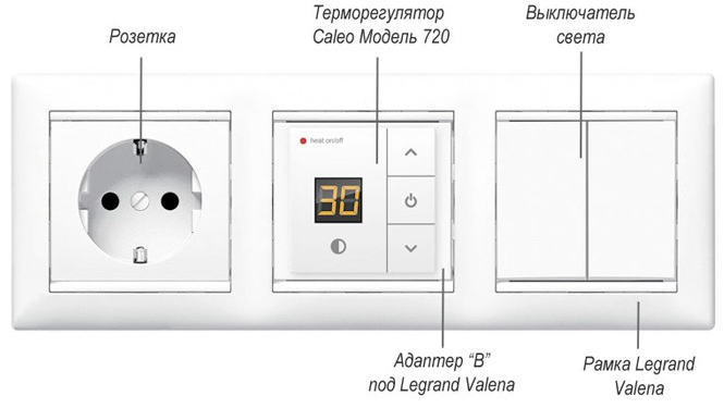 Встраиваемый цифровой терморегулятор теплого пола Caleo 720 Silver имеет возможность монтажа в рамки электроустановочных изделий таких производителей, как Legrand, ABB, Schneider Electric, Jung, Gira и Simon, благодаря комплекту адаптеров, входящих в комплект поставки!