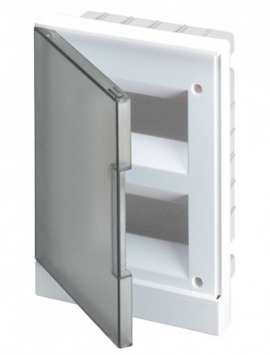 Пластиковые встраиваемые распределительные боксы ABB Basic E, вместимостью от 2 до 36 модулей, выпускаются с дверцами двух цветов - белый и дымчато-серый.